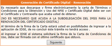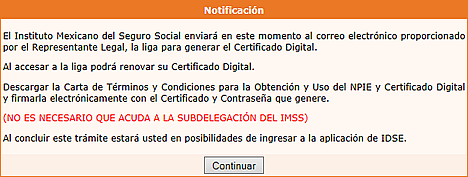 El certificado digital del IMSS, que se utiliza para acceder a la plataforma digital IMSS Desde Su Empresa (IDSE) tiene una vigencia de dos años, y puede ser renovado a través de Internet, evitando así tener que acudir personalmente a la delegación.